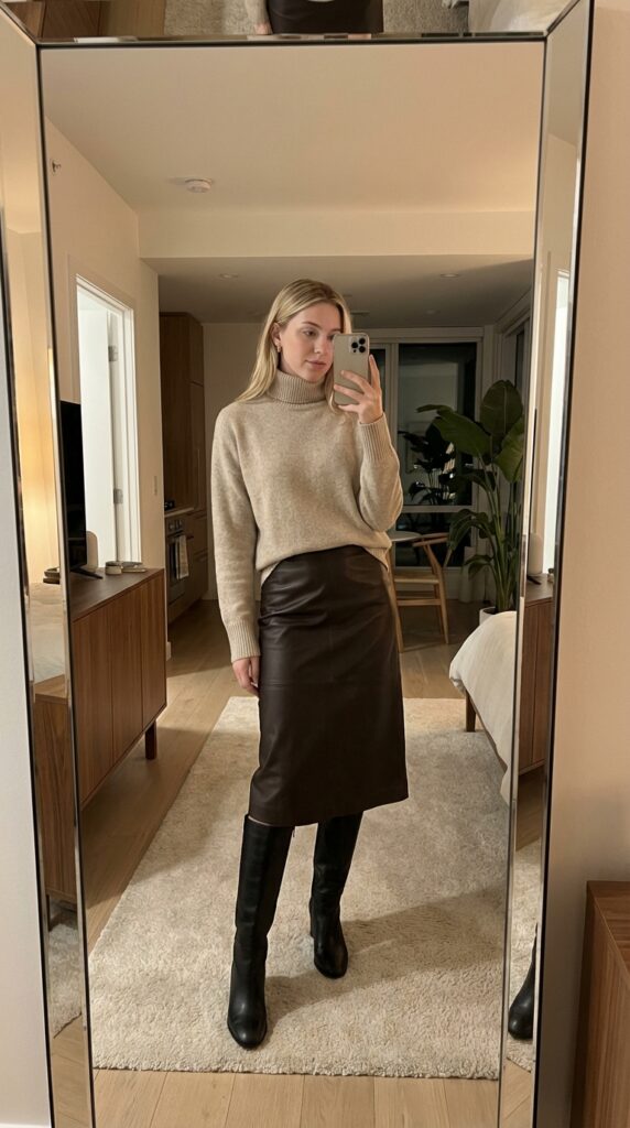 Pair your turtleneck with a leather skirt at midi length for an effortlessly chic combination. The contrast between soft cashmere and structured leather creates visual interest that’s both modern and timeless. I’ve found this pairing works beautifully in neutral tones like cream, camel, or classic black.