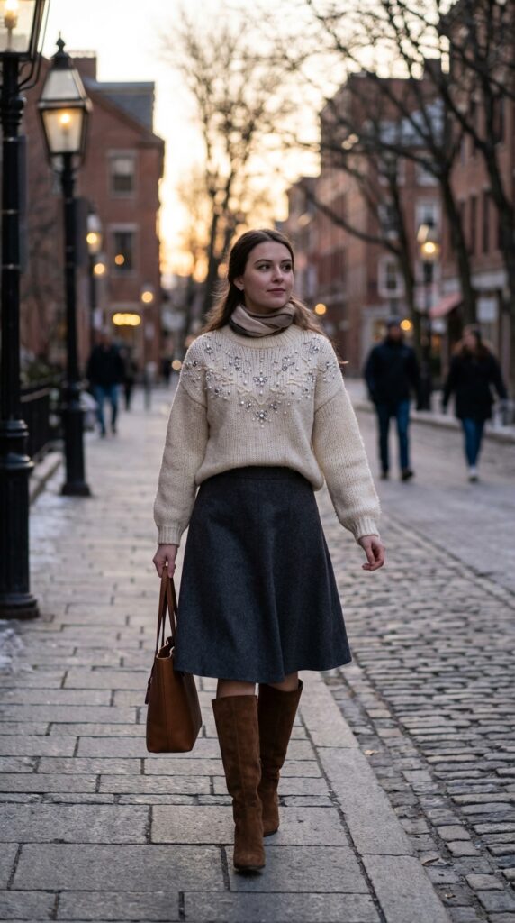 Why settle for boring winter layers when an embellished sweater with an A-line skirt and knee-high boots delivers both warmth and birthday-worthy glamour?