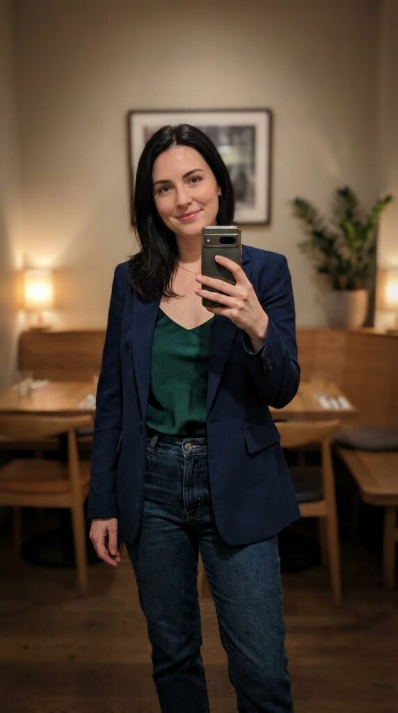 Pair your blazer with dark wash denim jeans for the perfect balance of dressy and relaxed. The deep indigo creates a sleek silhouette that’s birthday-appropriate without feeling overdressed. Sophisticated winter birthday outfits can work beautifully for intimate restaurant settings.