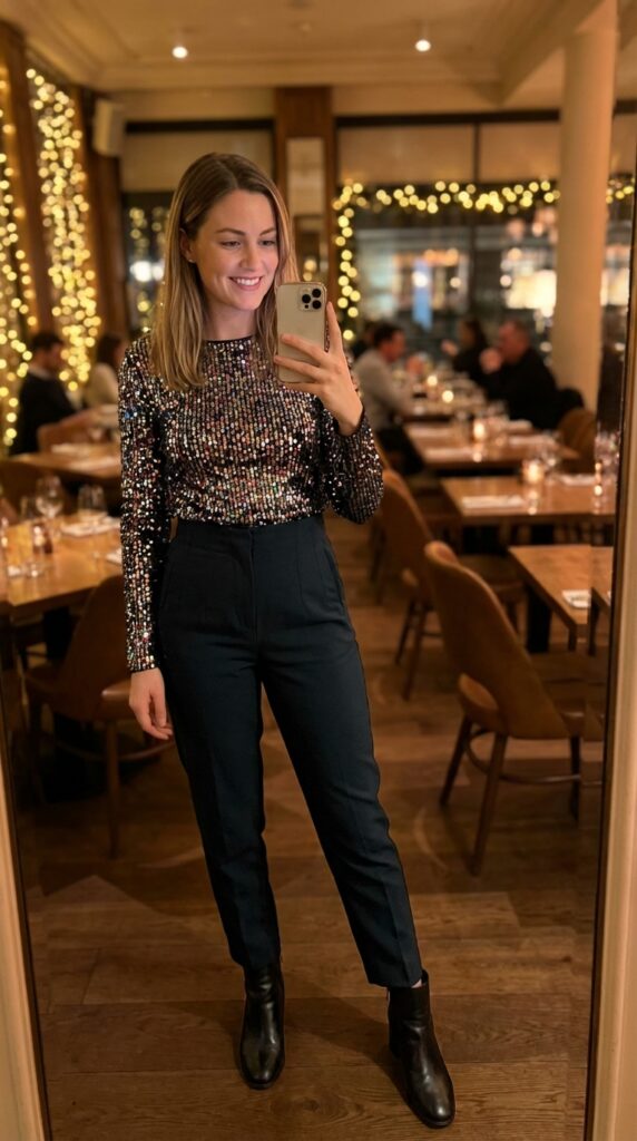 Pair your sparkly top with sleek black pants – they’ll ground the look and keep things sophisticated. I’ve found that high-waisted styles work best since they create a clean line that lets your sequined top be the star.