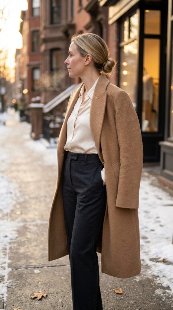 Silk Blouse With High-Waisted Trousers and a Wool Coat