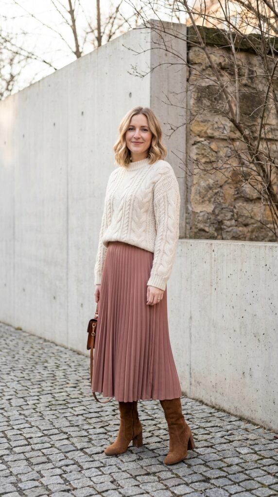 The textured details on your knit top become the star, so keep colors neutral – think cream, camel, or soft gray. Your pleated skirt adds movement and elegance, especially when you choose fabrics like wool crepe or ponte knit that drape beautifully.
