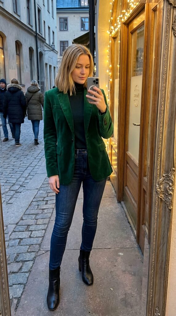 Your blazer becomes the hero piece here—it instantly redefines jeans into something more dressed up. Choose a structured wool blend or velvet option for seasonal appropriateness.