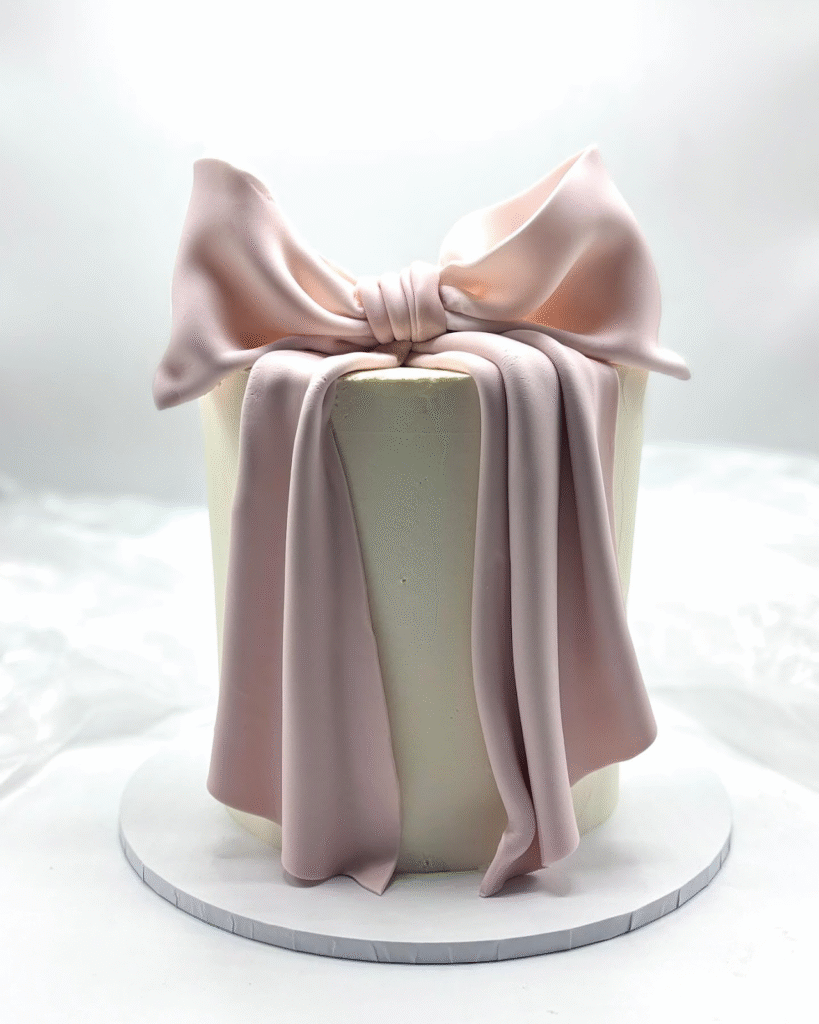 The flowing satin bow on top of the cake stands out for its simplicity and elegance. The smooth, polished finish of the fondant, paired with the soft pastel pink, makes this cake a timeless choice.