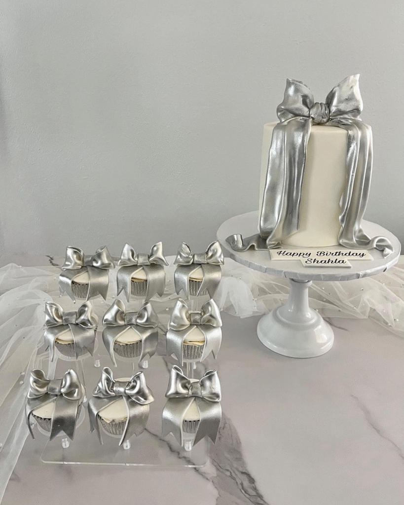 This beautifully designed birthday cake features a large silver satin bow, elegantly cascading down the sides. Paired with matching cupcakes, each decorated with a smaller silver bow, it makes for a stunning and coordinated celebration.