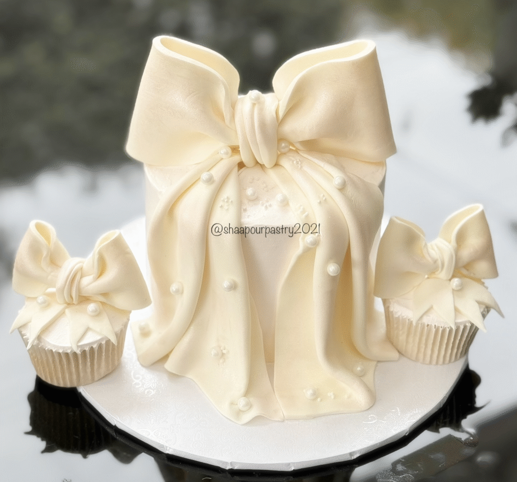 The delicate satin bow and pearl embellishments give the cake a sophisticated, timeless feel. The matching cupcakes complete the design, adding an extra touch of elegance and charm to the celebration.