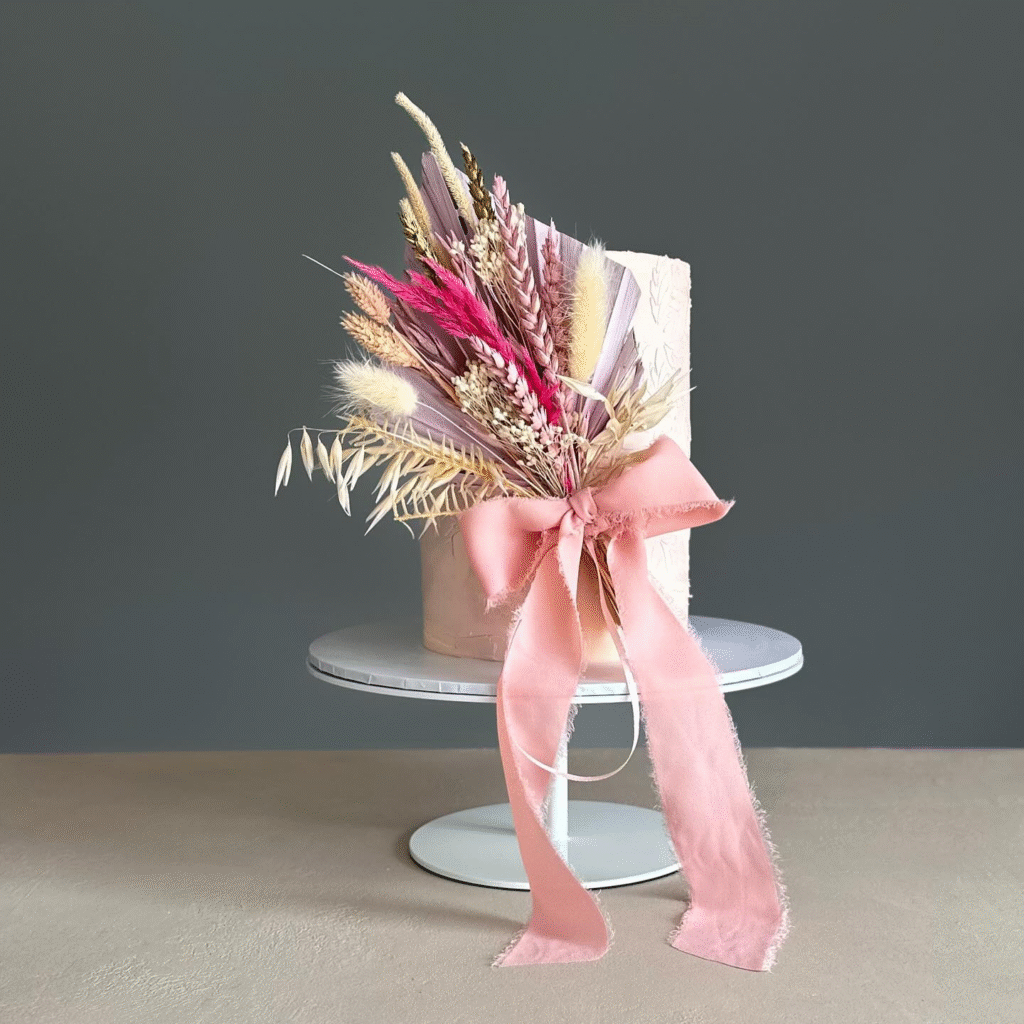 This exquisite cake features a chic design, with a gorgeous bouquet of dried flowers in soft hues of pink, lavender, and beige, paired with a delicate pink ribbon. The natural floral elements bring a fresh, elegant touch to the cake.