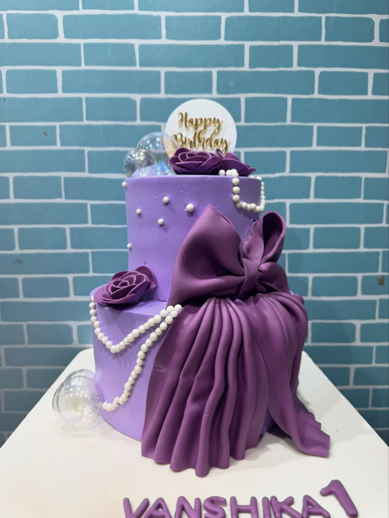 This stunning cake is designed to look like a gift box, featuring smooth purple fondant with a delicate satin bow on one side. The cake is decorated with beautiful purple roses and pearls, with a “Happy Birthday” topper adding the perfect finishing touch.