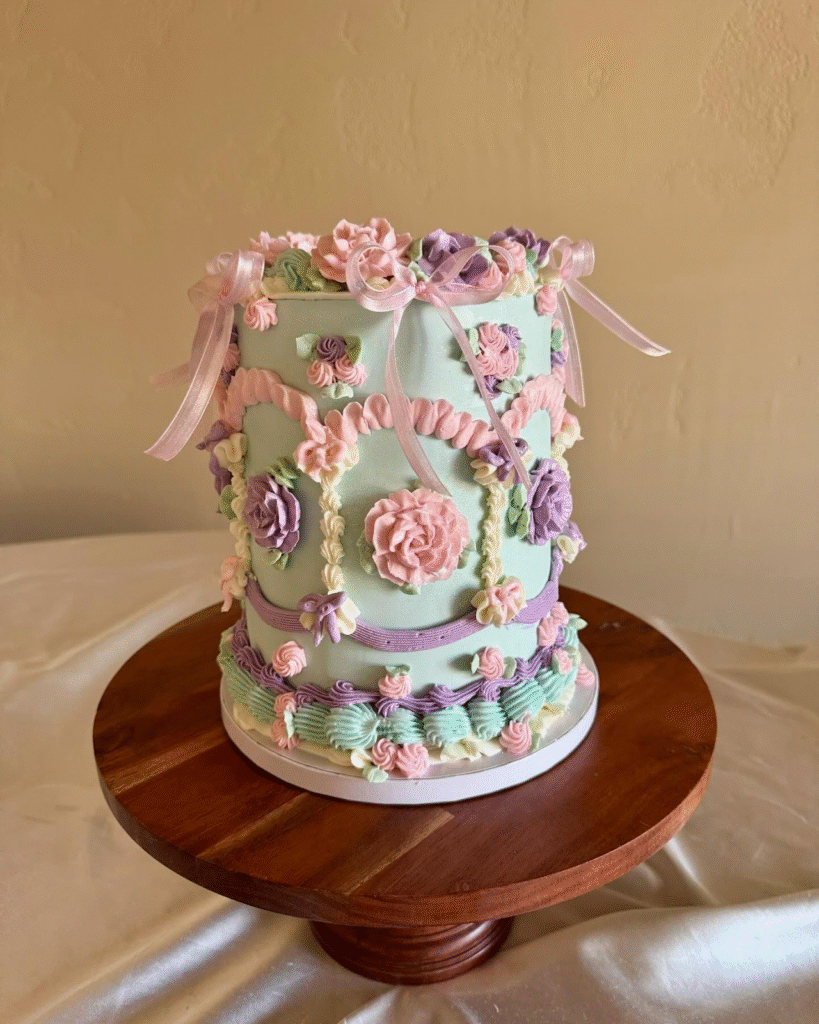 This enchanting cake features delicate pastel-colored flowers, including pink, lavender, and mint green, beautifully piped with buttercream. The soft, flowing ribbons add a playful touch, while the detailed decorations create a whimsical, yet elegant look.