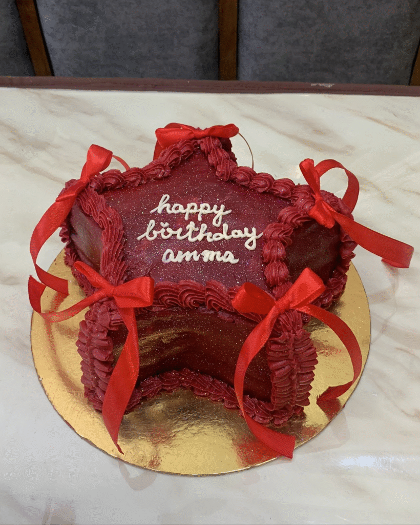 This eye-catching star-shaped cake is decorated in rich red frosting, with delicate red ribbons tied at each corner. The cake features sparkling accents and is topped with a sweet “Happy Birthday Amma” message in white, adding a personal touch.