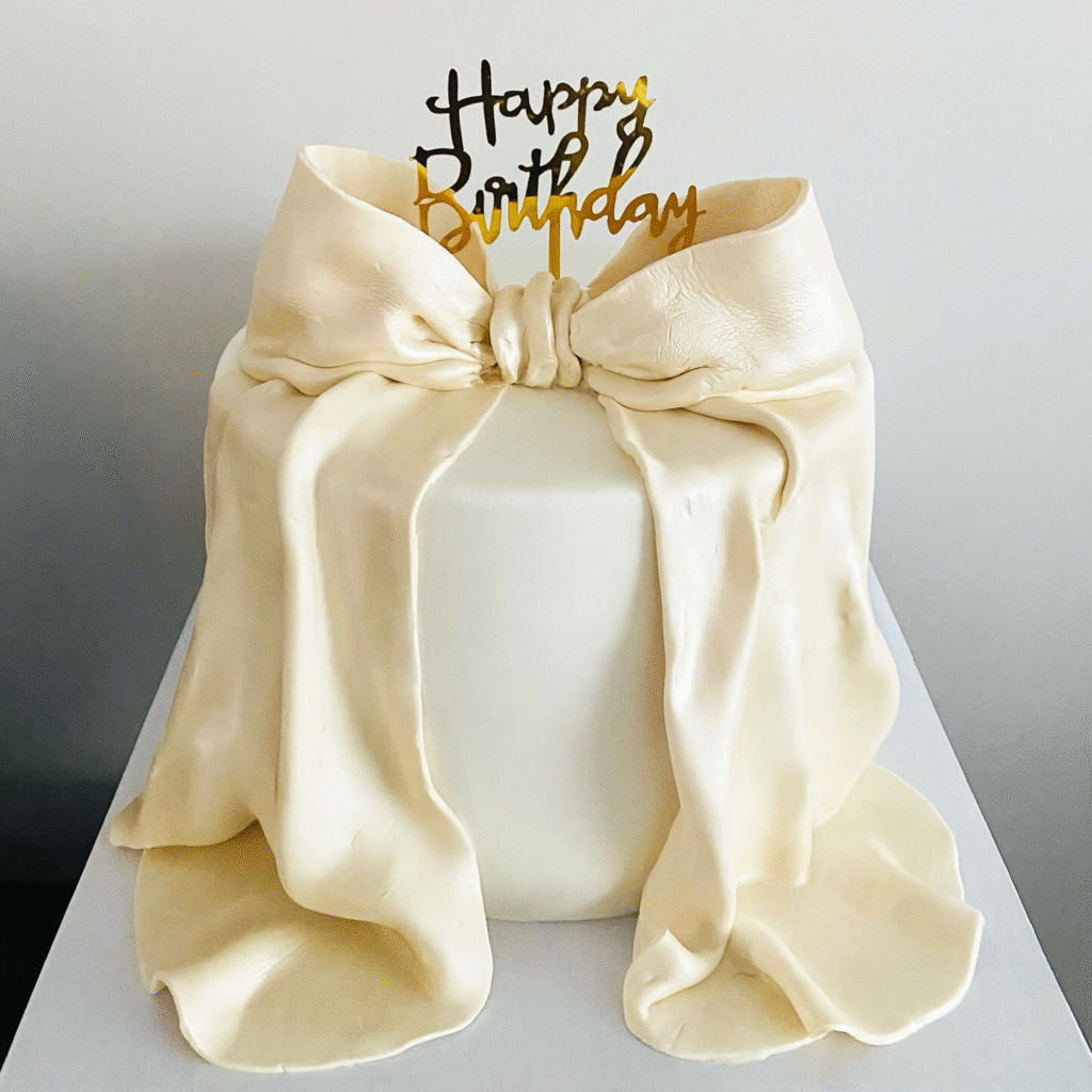 This chic cake features a smooth ivory base, adorned with a large, soft satin bow and a golden “Happy Birthday” topper. The luxurious bow cascades down, creating a sophisticated and stylish look that is perfect for any elegant birthday.
