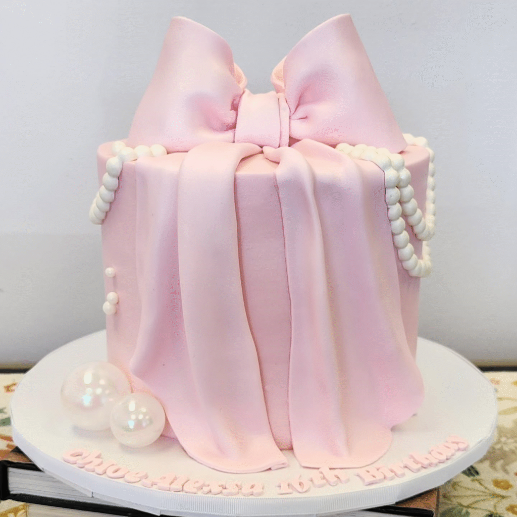 This beautiful cake is designed like a gift box, adorned with a soft pink satin bow and delicate pearls. The smooth fondant gives it a polished appearance, while the pearls add a luxurious touch to the design, making it perfect for a refined celebration.