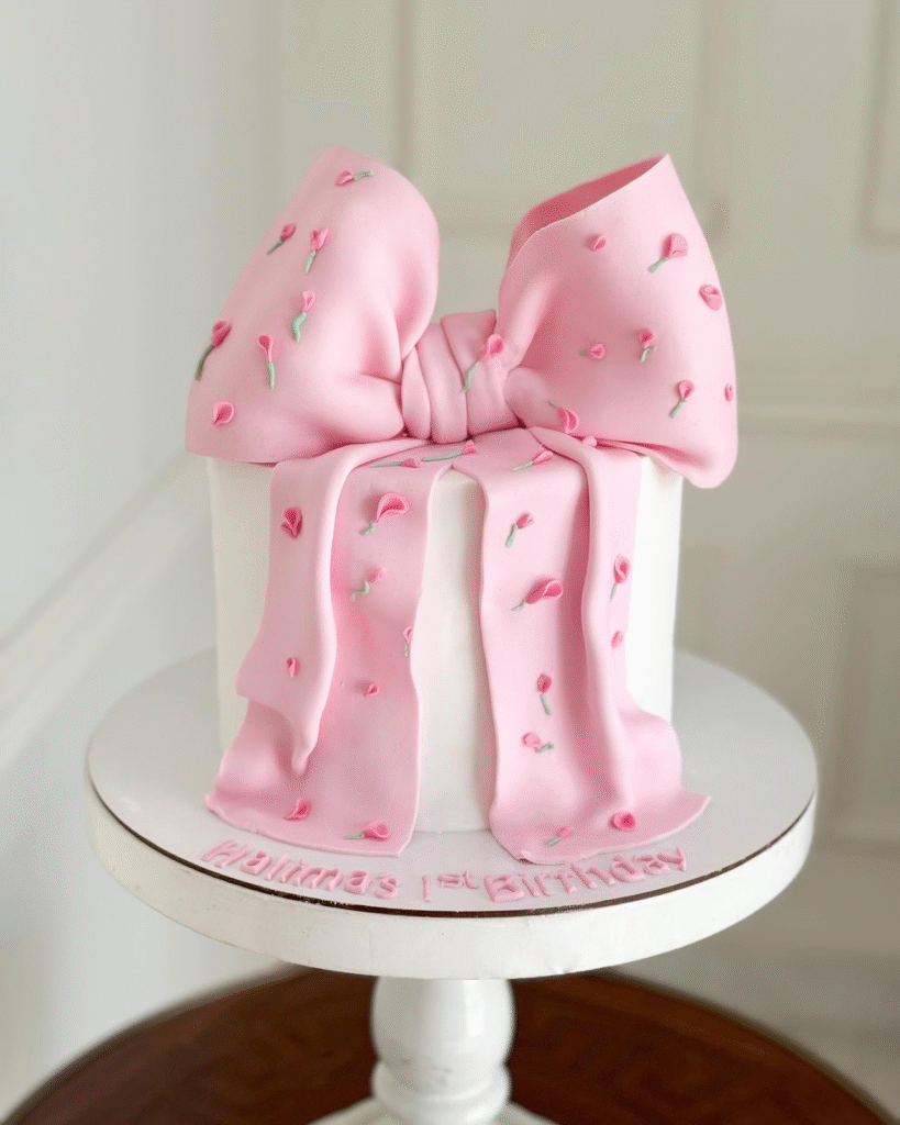 This charming cake features a large, delicate pink bow made from fondant, adorned with tiny floral accents. The bow cascades down the cake, creating a beautiful design that is both playful and sophisticated. The “Happy 1st Birthday” message adds a personalized touch.