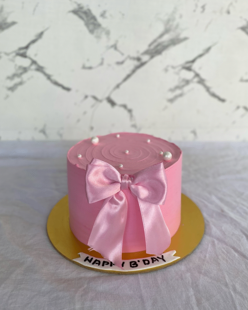 This soft pink cake is elegantly adorned with a large satin bow and delicate pearl accents on top. The smooth frosting is finished with a beautiful swirl design, giving the cake a clean and sophisticated look. The “Happy B’Day” message adds a personal touch.