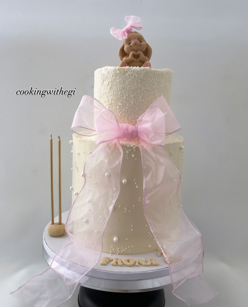 What Makes This Image Stand Out: The bunny topper, soft pink ribbon, and pearl details create a playful yet elegant design, making this cake an ideal choice for a special celebration.