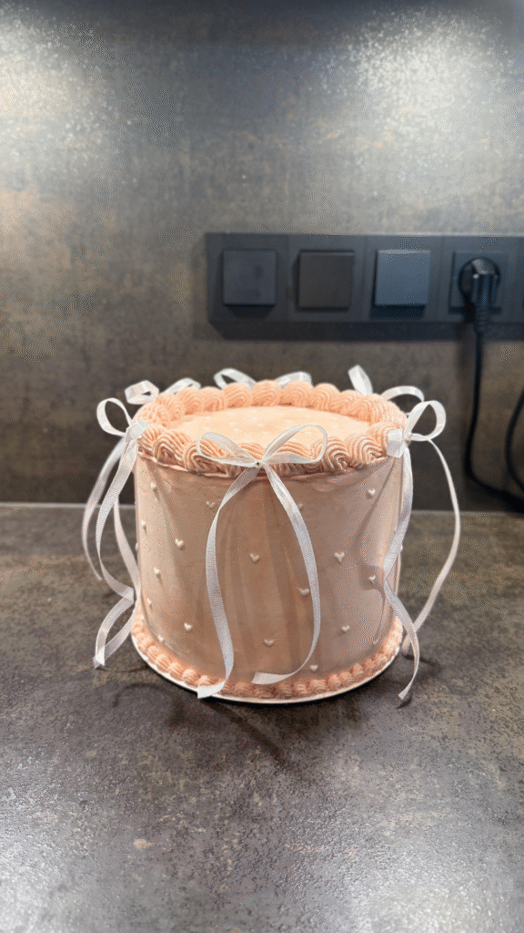 The heart detailing and delicate ribbons create a charming yet sophisticated aesthetic, making this cake ideal for a birthday or special occasion. Its soft, pastel color palette, combined with the ribbon decoration, gives it a timeless and refined look.