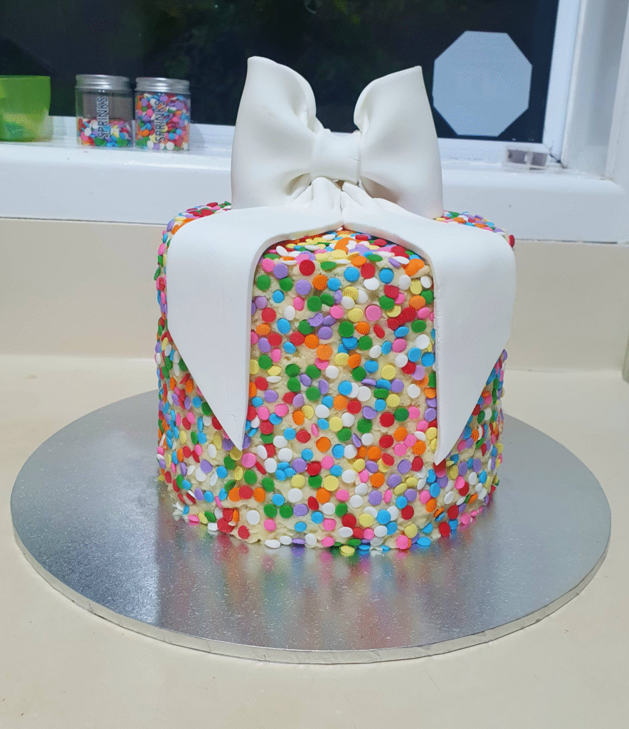 Colorful Sprinkle Cake with Elegant White Bow Design