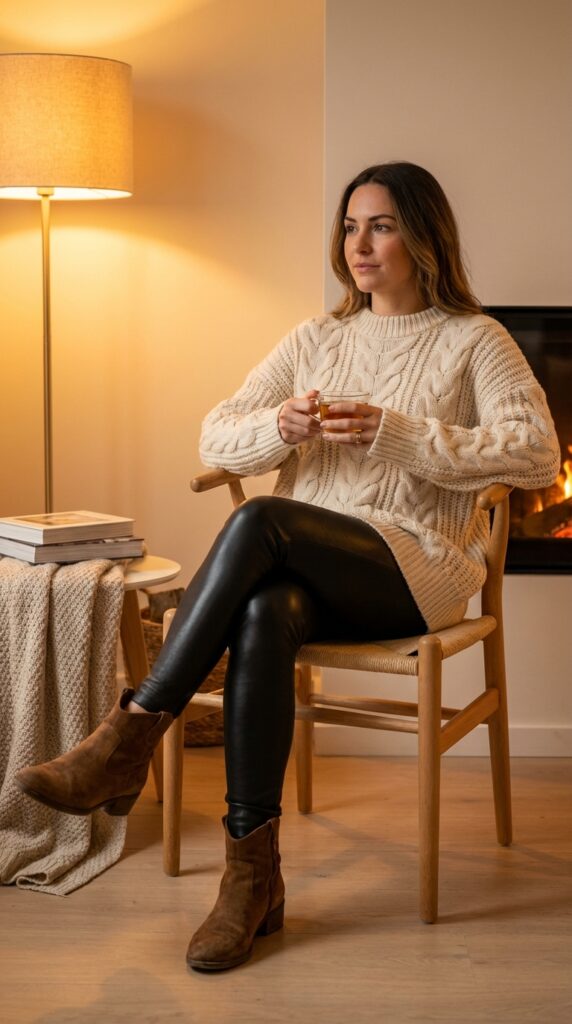 This combination creates beautiful layered textures that feel both comfortable and put-together. The chunky knit contrasts beautifully against smooth leather, while ankle boots ground the look with practical warmth. I love how this outfit works for everything from brunch parties to evening dinners.