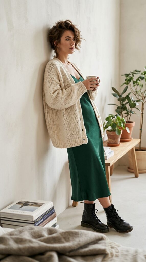 Contrasting silhouettes make this outfit sing. The fitted slip dress hugs your curves while the oversized cardigan creates relaxed structure. Combat boots add unexpected edge—trust me, this trio works beautifully for casual birthday celebrations where you want comfort without sacrificing style.