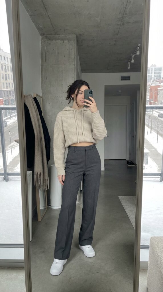 You’ll love how the cropped silhouette creates visual balance with flowing wide-leg pants. This proportion trick makes your legs look miles long while keeping you incredibly comfortable. Choose a hoodie in soft cotton or fleece for that cozy layering effect you crave in winter weather.