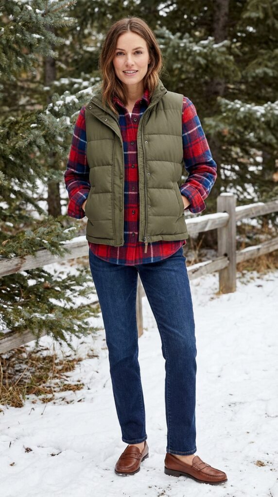 Flannel Shirt Layered Under a Vest With Denim and Loafers
