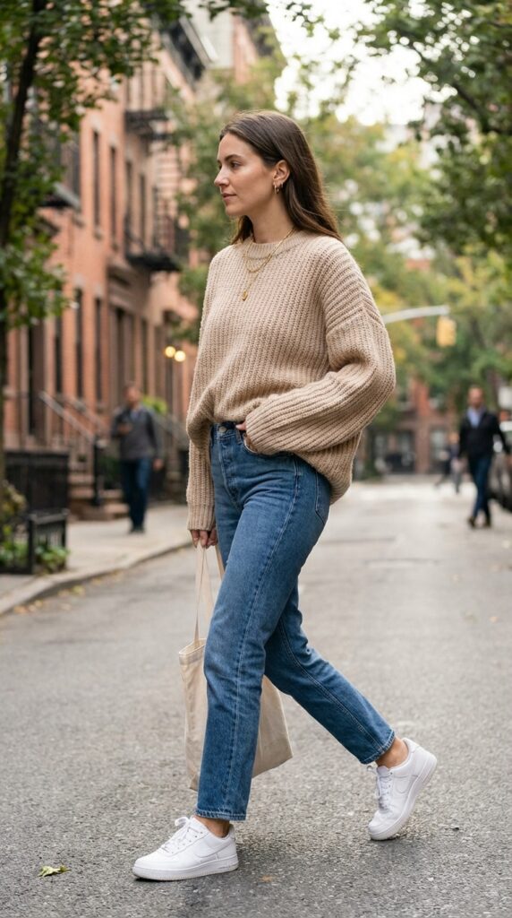 High-waisted jeans elongate your legs and create a flattering silhouette when tucked with your sweater. White leather sneakers keep things casual while still looking polished. Think clean, minimalist styles that won’t compete with your sweater’s texture. Add delicate jewelry and a structured crossbody bag to amplify the look without sacrificing that effortless vibe you’re after.