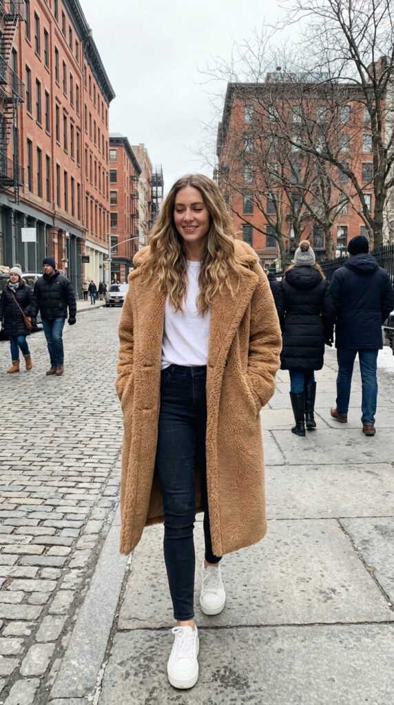 Your teddy coat becomes the star here—choose oversized styles in cream, camel, or even bold colors like rust. The fluffy texture instantly makes basic jeans and a fitted tee look intentional and polished.
