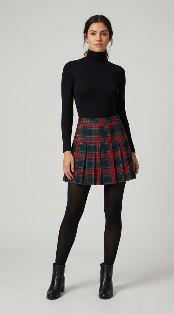 The beauty of this look lies in the contrast—a sleek, fitted turtleneck creates a polished base while the plaid mini adds playful texture. You can opt for an oversized turtleneck if you prefer more coverage, simply tucking it in for definition.