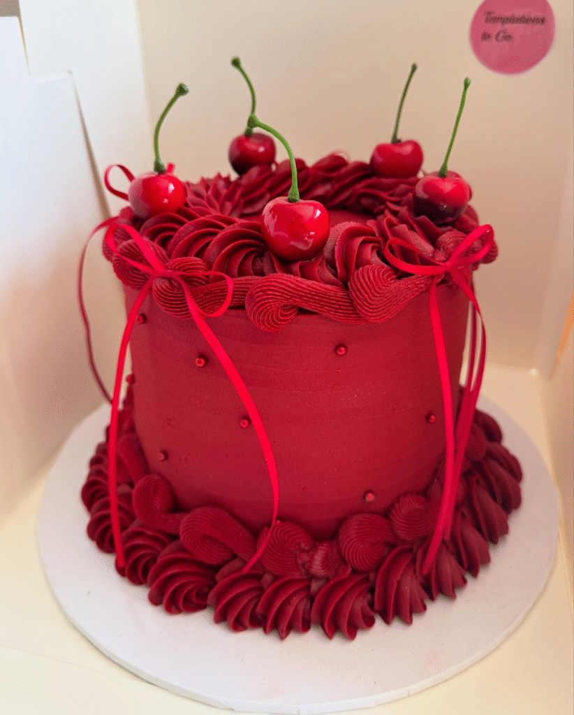This red velvet cake exudes elegance with its deep red buttercream and intricate ruffles. The top is adorned with glossy cherries and red satin ribbons, giving it a touch of sophistication. The addition of shimmering edible beads enhances the cake’s luxurious design.