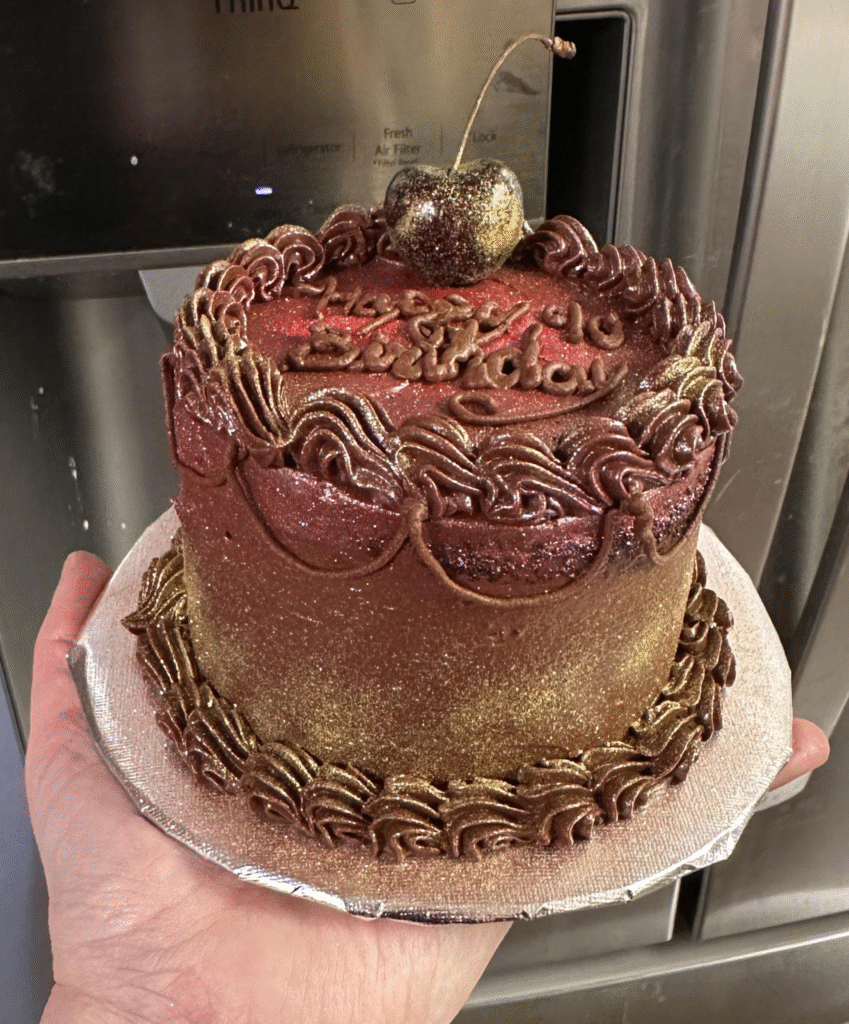 This stunning birthday cake features a perfect mix of chocolate frosting and shimmering gold glitter, creating a dazzling visual appeal. The cake’s soft, rosette frosting is artfully arranged, with a delicate golden cherry sitting on top to elevate the design. A sparkling “Happy Birthday” message completes the elegant look.