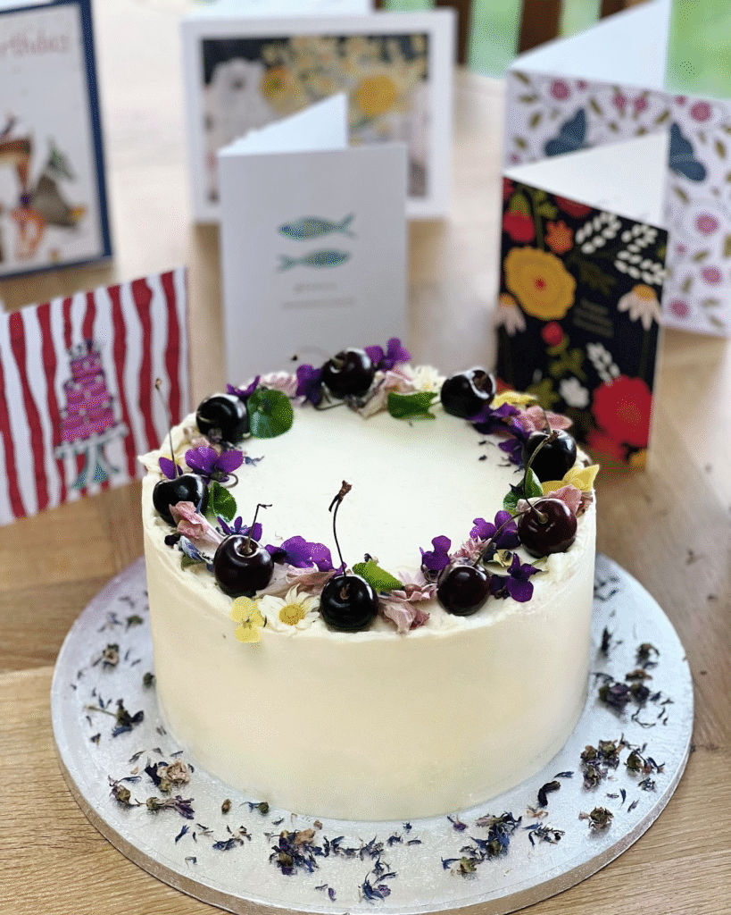 This cake is beautifully adorned with a wreath of fresh cherries, delicate edible flowers, and vibrant greenery, creating an elegant and natural look. The smooth white frosting serves as a perfect backdrop for the artistic floral design on the top and base of the cake.