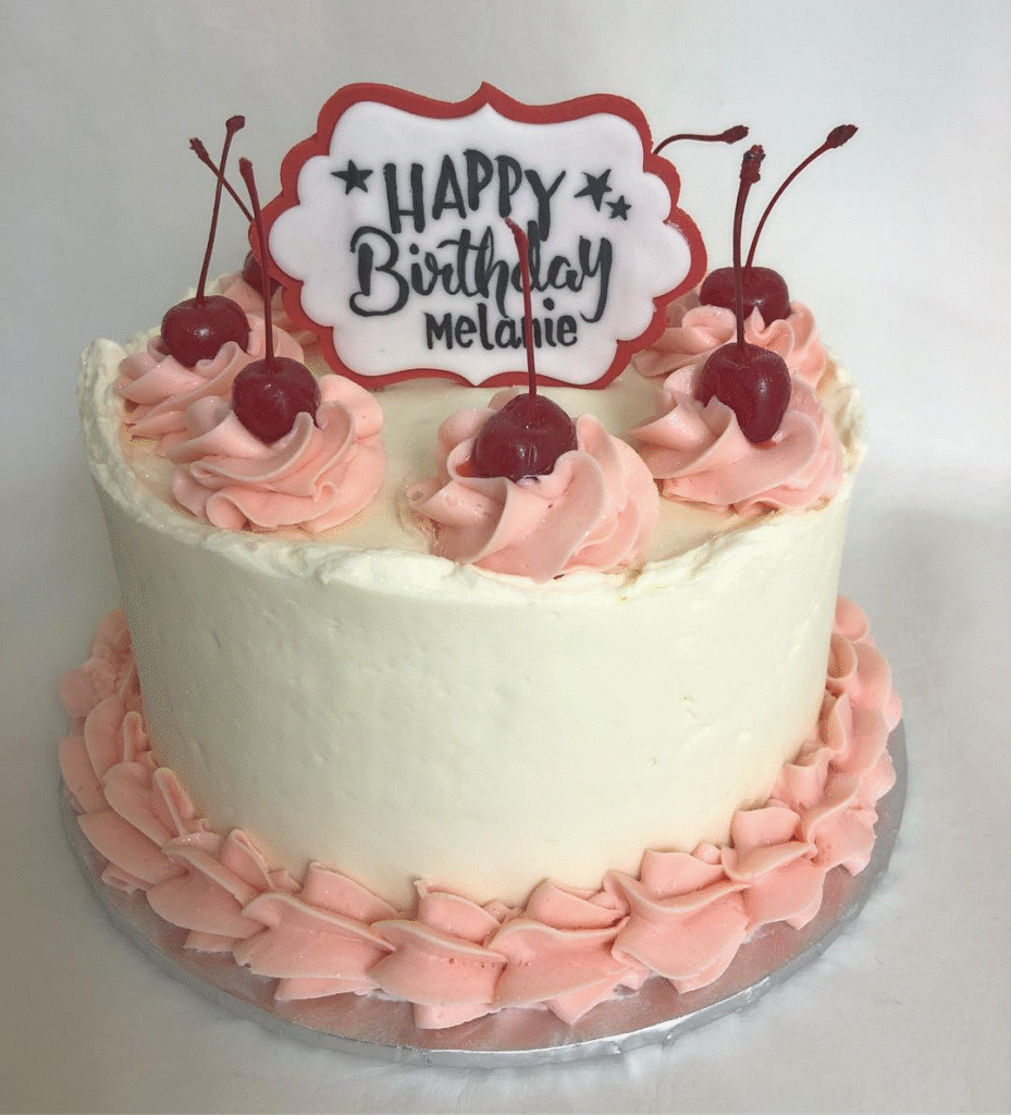 This lovely birthday cake is adorned with delicate pink buttercream swirls and crowned with ripe cherries, adding a fresh touch of color and sweetness. The smooth white frosting creates a stunning contrast, while the custom “Happy Birthday” topper adds a personal and charming touch.