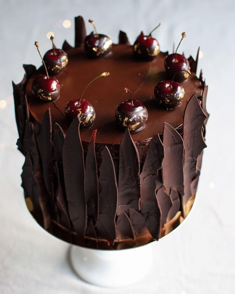 The careful arrangement of chocolate shards and gold-dusted cherries makes this cake a true masterpiece, perfect for special celebrations. It’s a dessert that balances elegance with indulgence, offering both visual appeal and a rich, decadent taste.