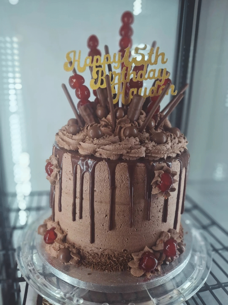 With its dramatic chocolate drips, sweet cherries, and a sprinkling of sparkles, this cake blends fun and sophistication, perfect for any special occasion that calls for a show-stopping dessert.