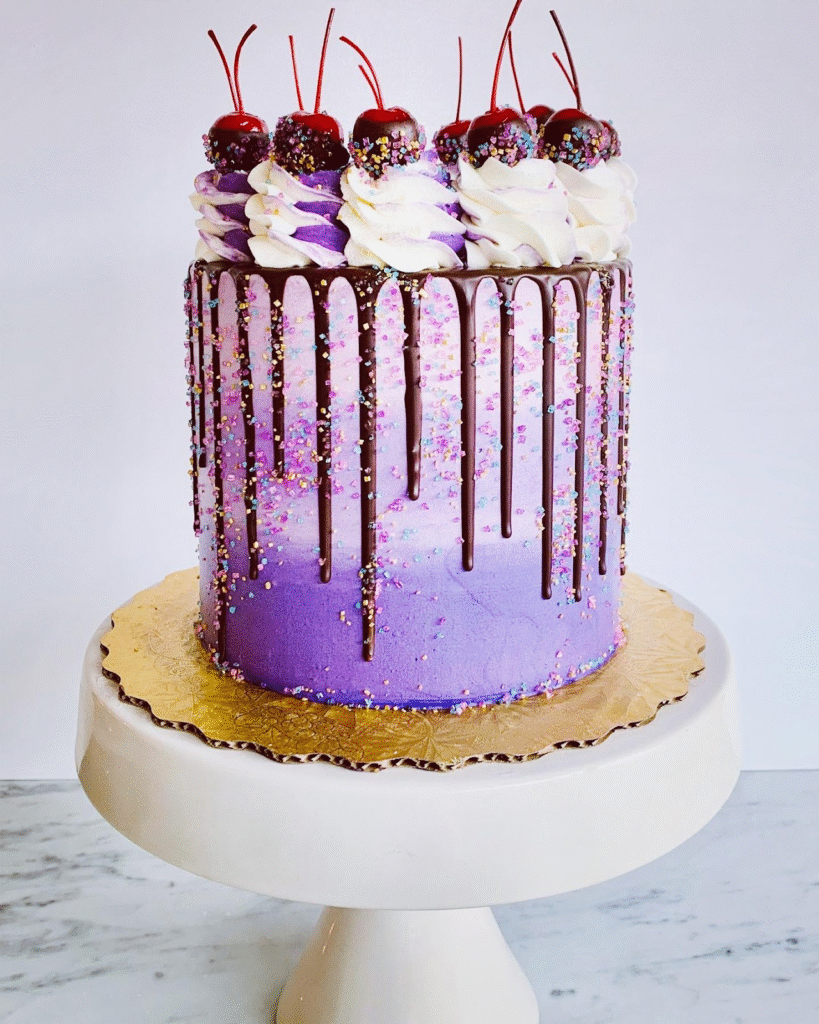 This cake features a beautiful purple gradient, complemented by creamy white and purple swirled piping and topped with glossy chocolate drips. A touch of sparkle is added by colorful sprinkles and vibrant cherries.