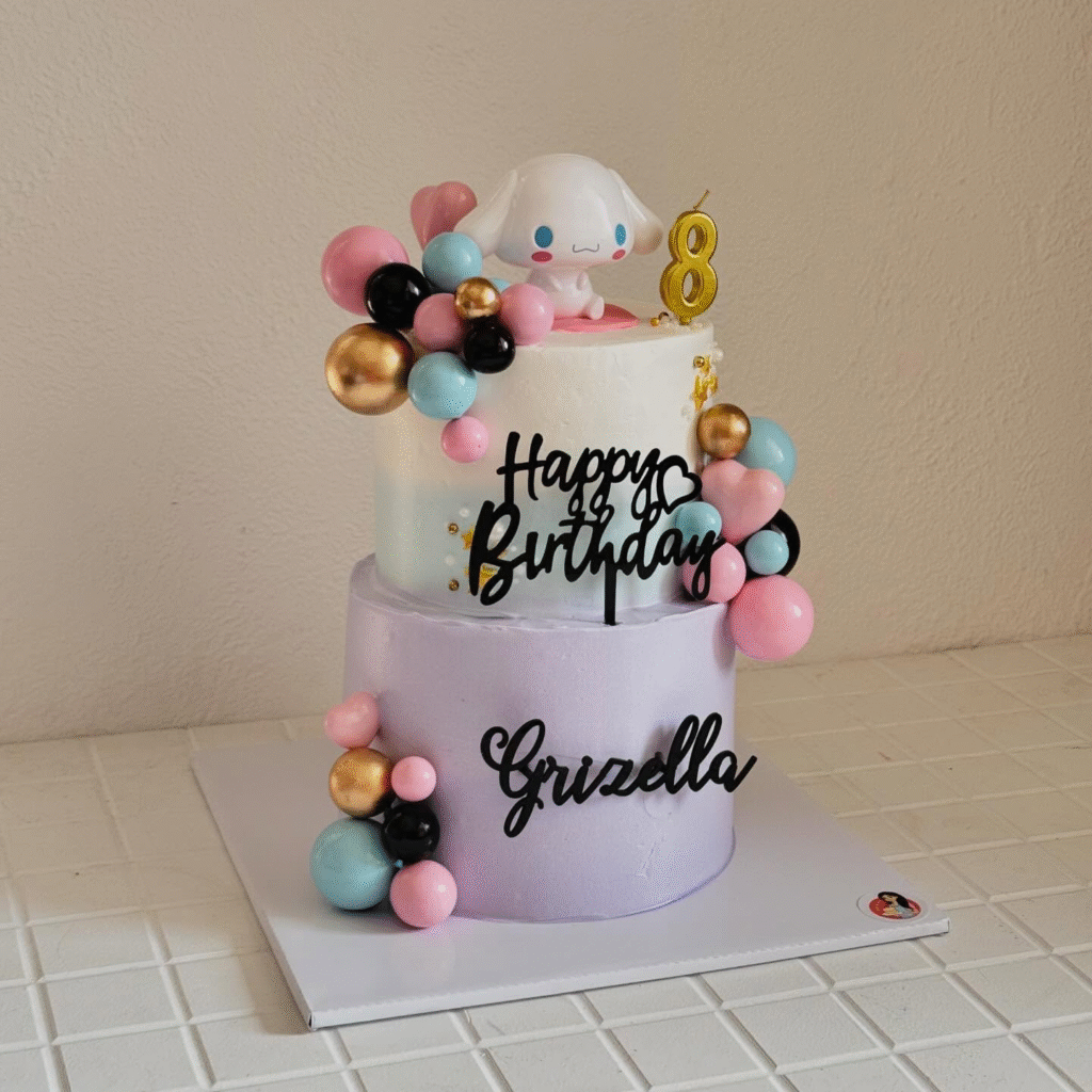 A playful two-tiered cake brings joy with its pastel colors and cheerful design. The top tier is adorned with a cute figurine, while the lower tier features vibrant, round balloons in shades of pink, blue, black, and gold. Each decoration adds a pop of fun, with the smooth frosting creating a soft, clean backdrop for the lively details.