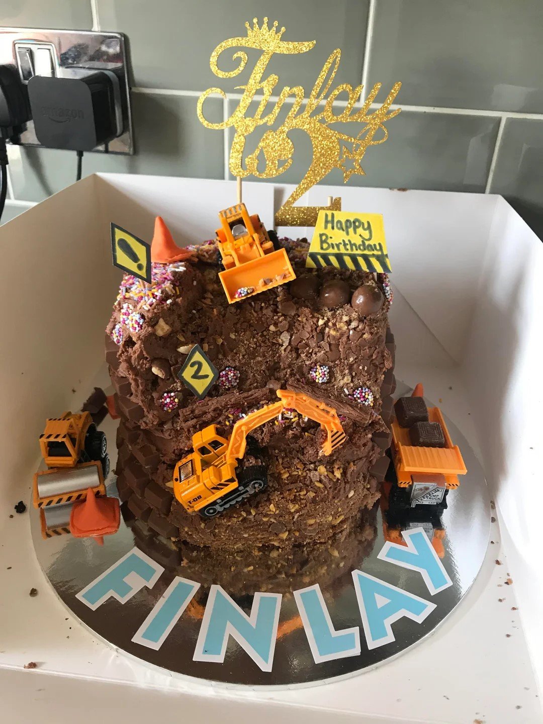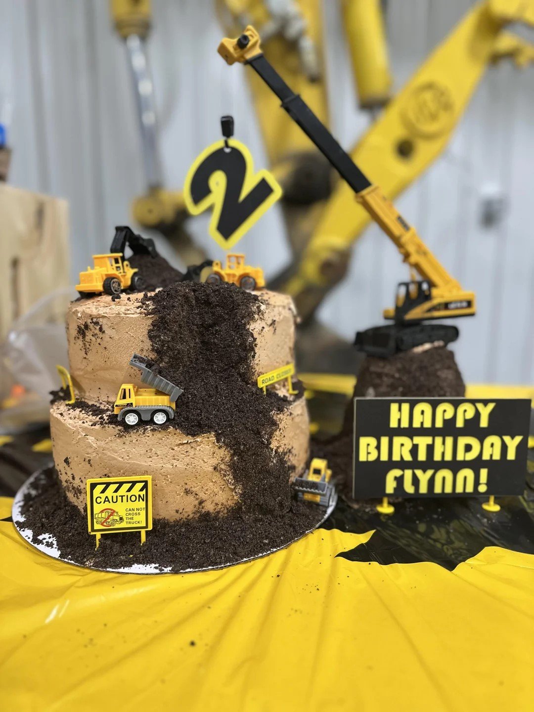 Two tiers of creamy brown frosting set the stage for a lively construction-themed masterpiece. Crumbled cookie “dirt” cascades down the cake, giving the illusion of an active worksite where toy trucks are hard at work. A towering crane lifts a bold number “2,” making the milestone age the star of the design. Yellow caution signs, playful construction vehicles, and a cheerful “Happy Birthday, Flynn” sign add personality and excitement to the setup.