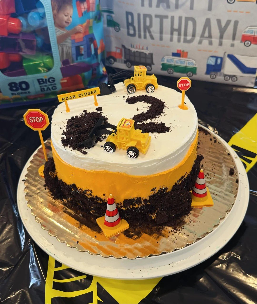 Bright white and golden-yellow frosting creates a striking base for this playful construction-themed cake. The top is decorated with cookie crumbles forming a bold number “2,” making it perfect for a milestone celebration. Tiny toy trucks and loaders work their way through the “dirt,” adding a fun and lively touch. Road signs, traffic cones, and a “Road Closed” marker complete the theme, turning the cake into a mini worksite scene.