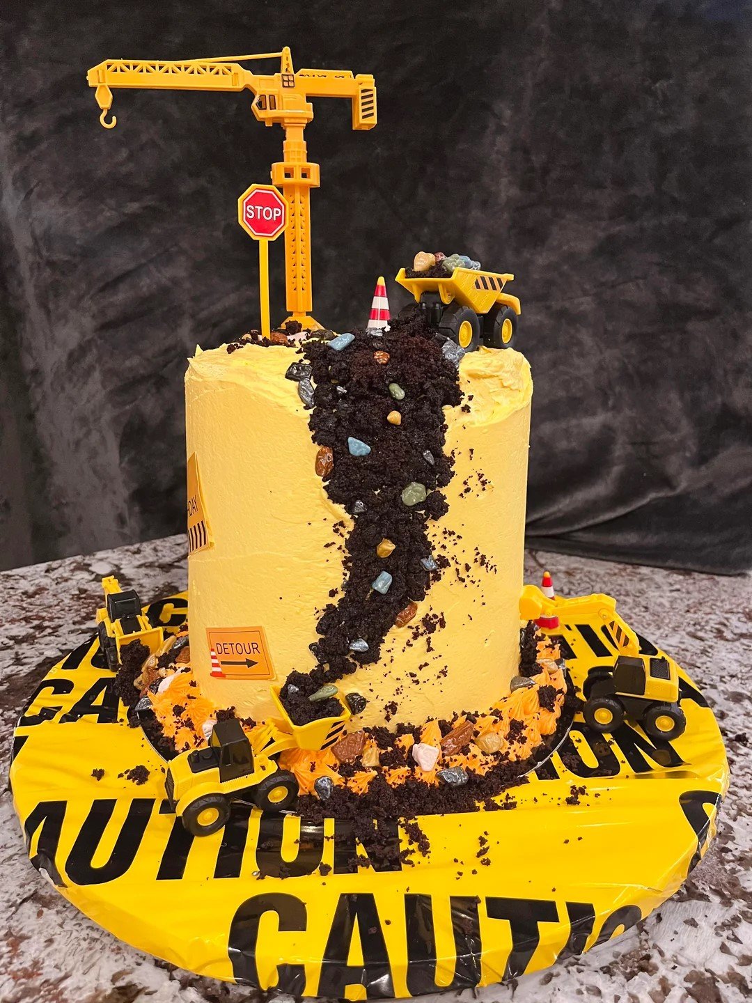 Bright pops of yellow contrast beautifully with the earthy tones of the frosting and crumbs, creating a vibrant and eye-catching look. Perfectly crafted to spark joy, this cake combines creativity, flavor, and fun, becoming an unforgettable centerpiece for a little builder’s special day.