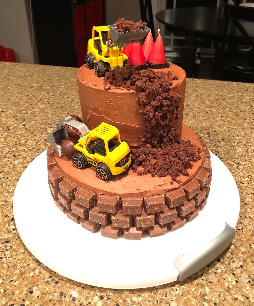 Why We Picked This Image: Unique KitKat border, bold toy trucks, and realistic dirt details make this construction cake exciting and visually creative.