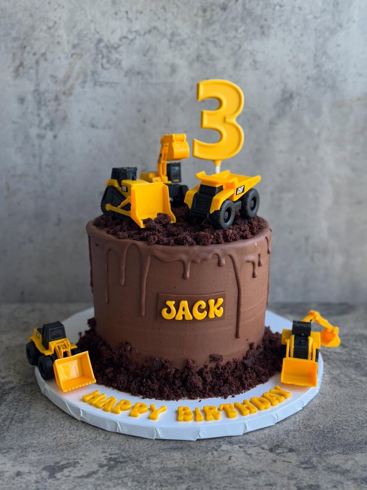 Rich chocolate frosting with a smooth drip effect makes this cake an irresistible centerpiece for a fun celebration. Bright yellow toy trucks and diggers are hard at work on top, scooping and dumping crumbled chocolate “dirt” that looks deliciously realistic. The bold number “3” topper adds a cheerful pop of color, marking the birthday milestone perfectly.