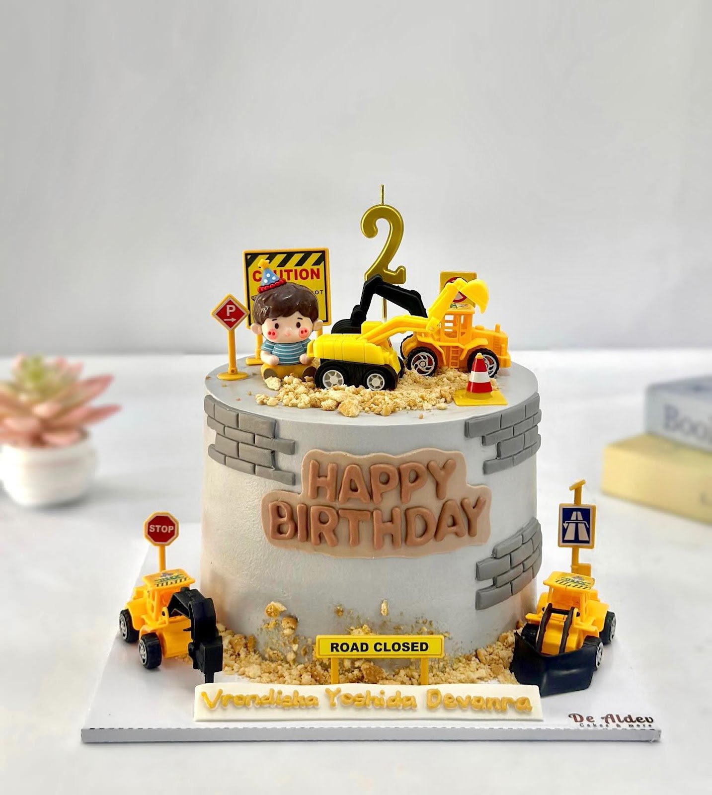 Smooth grey frosting styled like a brick wall creates a bold base for this imaginative construction-themed cake. Bright yellow toy trucks, playful road signs, and tiny fondant cones transform the design into a bustling worksite full of fun. Crumbled cookies scattered across the top mimic sand and dirt, while a shiny golden “2” candle celebrates the milestone age.