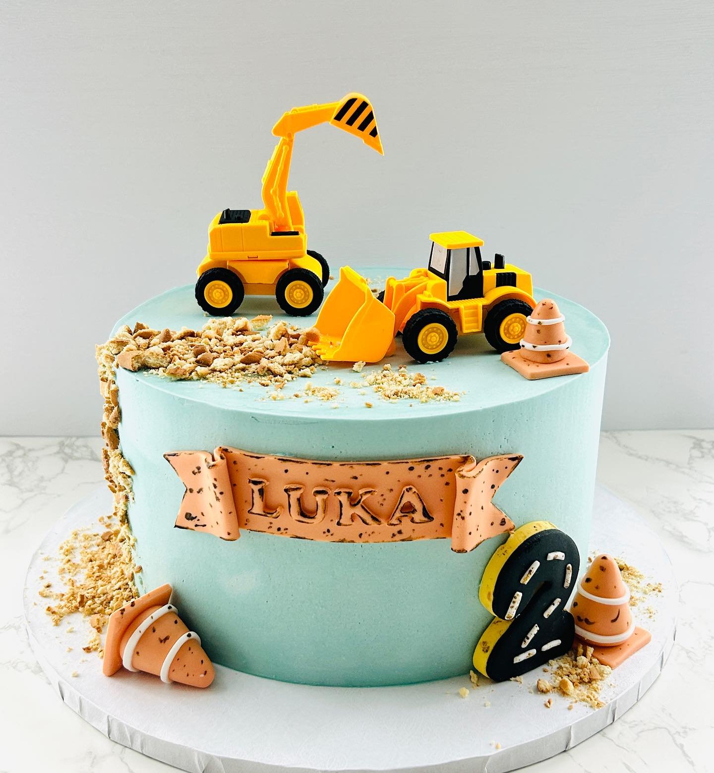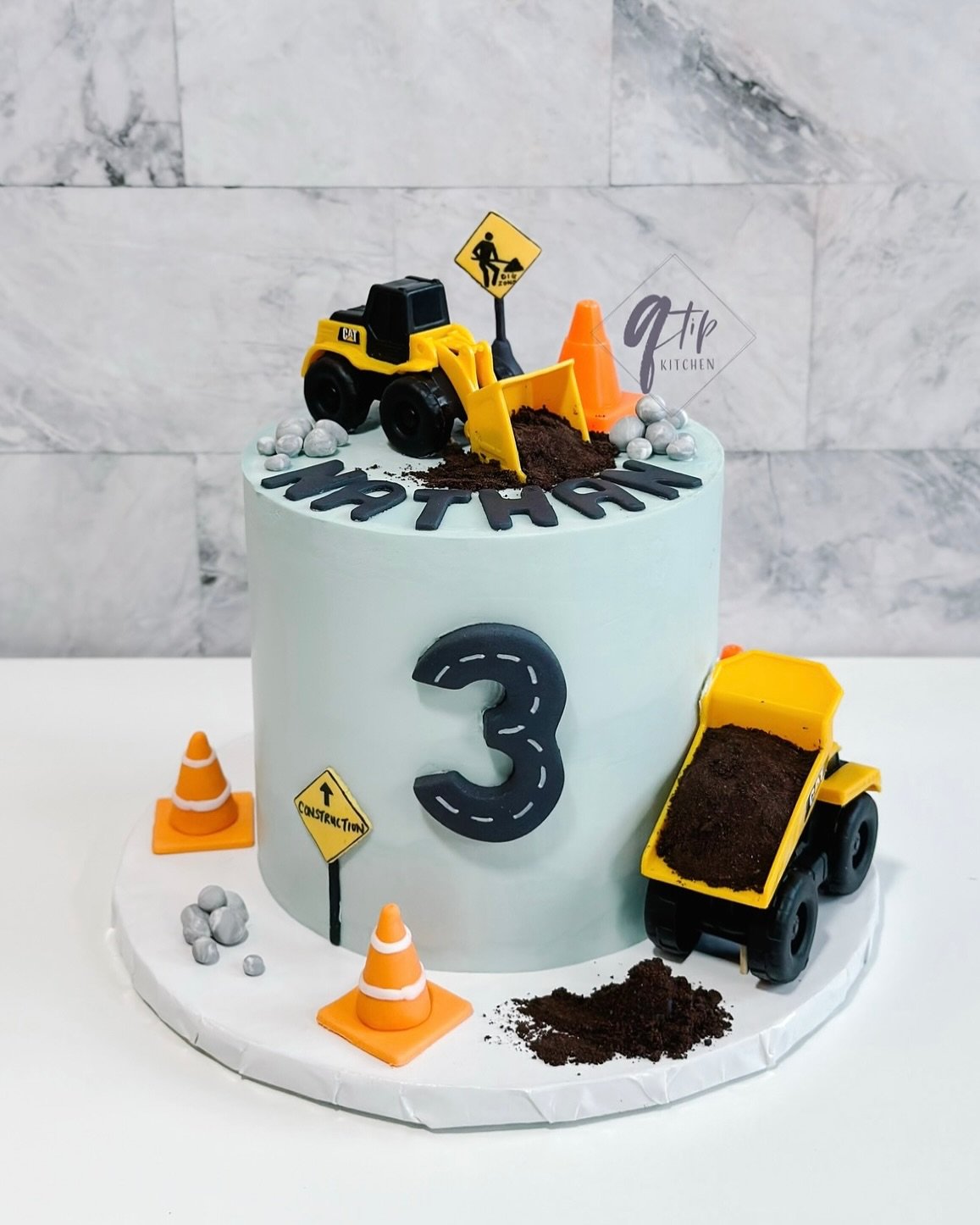 Soft pastel blue frosting provides a fresh and modern backdrop for this cheerful construction-themed cake. Playful yellow toy diggers and bulldozers sit atop, scooping cookie crumbs that resemble sand and gravel, bringing the theme to life. Neatly placed fondant cones, a mini fondant road, and a personalized name banner add character and charm to the overall design.