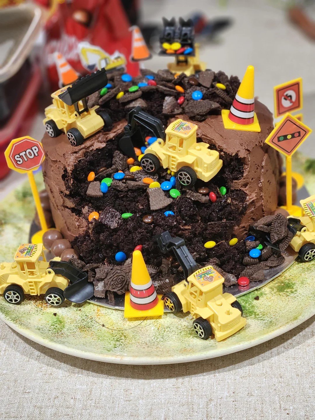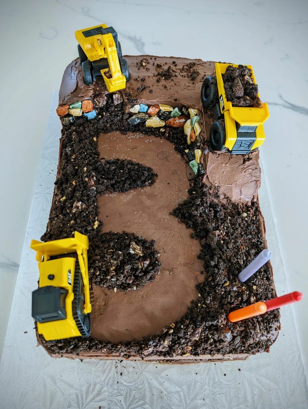 Why We Picked This Image: Playful construction trucks, candy rocks, and carved number design create a realistic and imaginative birthday cake scene.