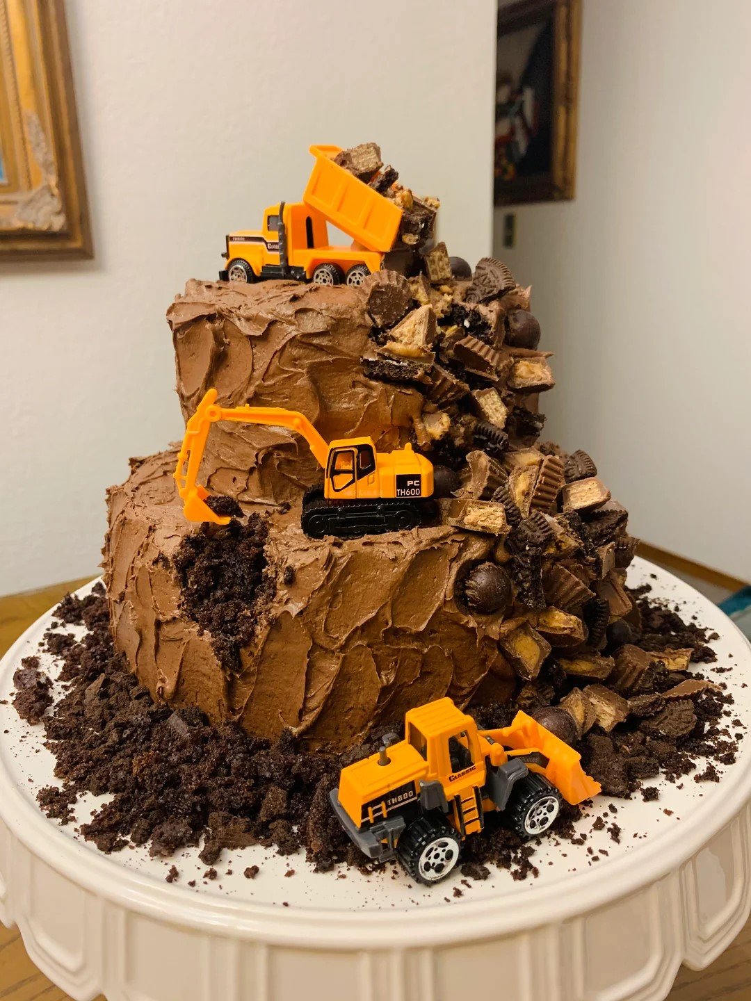 Why We Picked This Image: Creative crane topper, cascading cookie dirt, and bold construction details make this cake an exciting birthday centerpiece.