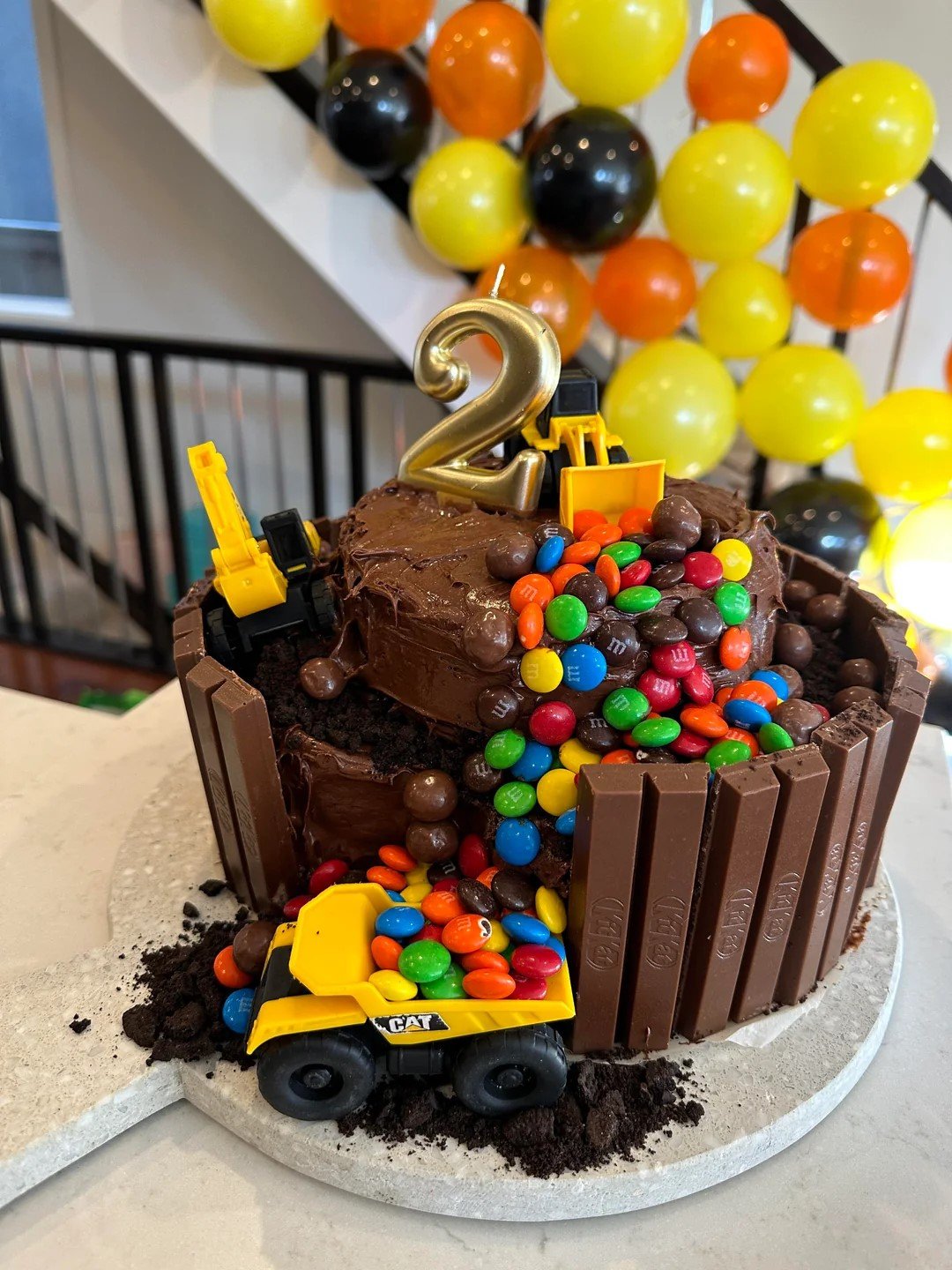 Mini construction vehicles add excitement, making the cake look like a sweet building site in action. The golden number “2” candle at the top shines brightly, perfect for celebrating a little one’s special milestone. Bright colors, candy overload, and construction details make this cake not only delicious but also an unforgettable centerpiece for a joyful party.