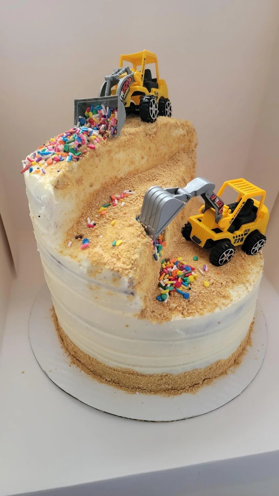Bright, cheerful, and playfully designed, this birthday cake combines creativity with fun in the sweetest way possible. Smooth white frosting creates a clean base, while golden cookie crumbs look at sandy construction terrain. Two vibrant yellow toy excavators are hard at work, scooping and dumping colorful rainbow sprinkles to mimic a playful worksite.