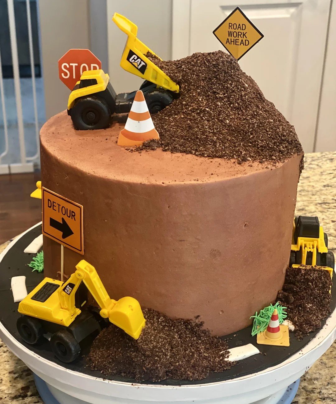 Why We Picked This Image: Construction theme, edible rubble, and playful toy trucks create an imaginative cake full of energy and detail.