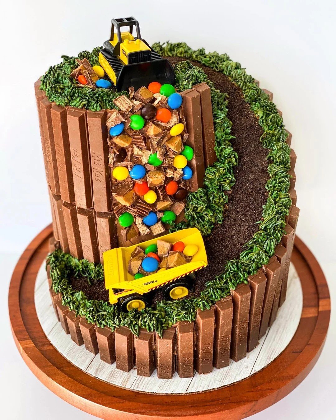 Why We Picked This Image: Vibrant candies, chocolate KitKat borders, and toy trucks create a lively construction-themed cake full of playful imagination.