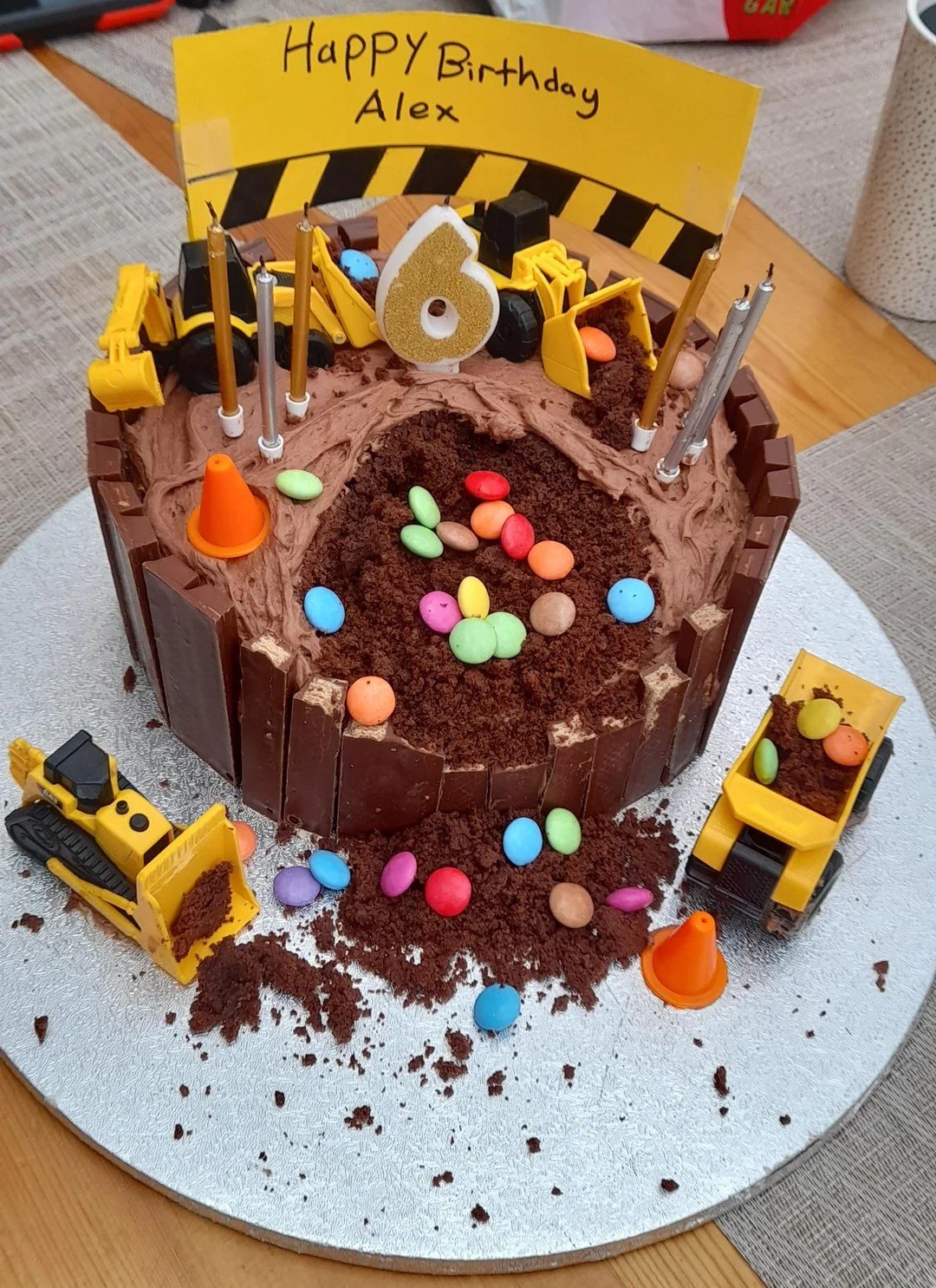Bursting with creativity, this cake transforms a birthday celebration into a playful construction site. Smooth chocolate frosting is topped with a pit of crumbled “soil,” sprinkled with colorful candy pieces for a vibrant touch. KitKat bars line the sides, forming a sturdy edible wall that gives the cake a bold structure. Bright yellow toy diggers, dump trucks, and tiny cones add excitement, making the cake feel like a real work zone in action.